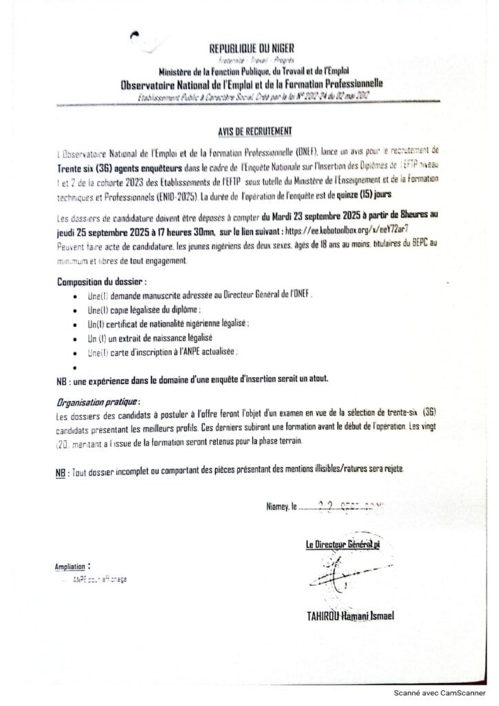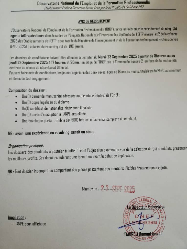 par : Webmaster 13 décembre 2015 Recrutements offres d’emploi récents Agent enqueteur N’importe où Recrutement de Trente-six (36) agents enquêteurs Niamey Observatoire National de l'Emploi et de la Formation Temporary Informaticien Niamey Observatoire National de l’Emploi et de la Formation Full Time Share FacebookTwitterPinterestEmail